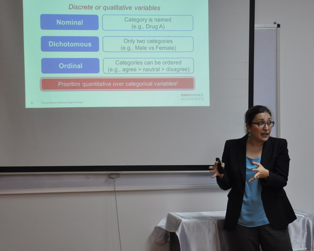 In cooperation with Egyptian Knowledge Bank, a workshop was held on Thursday 15th of March 2018 entitled “Clinical Research Methodology” introduced by Dr. Lea Gagnon, Editorial Development Advisor, Ph.D. from the University of Montreal. The objectives of the workshop were to formulate a concise and impactful research question, understand the most common epidemiological measures, strategically select and sample enough study participants to achieve high-power, calculate, report and interpret different effect sizes, and choose the best study design according to your study aim.