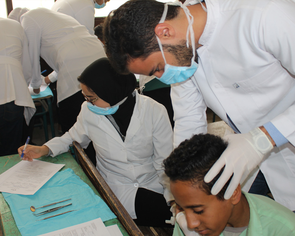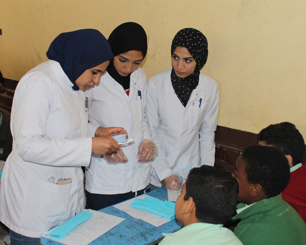 Four forms of questionnaires were distributed: one at the beginning of the session for the school residents to determine their dental health needs, the second was for the administrative staff to determine the needs of the school, a third questionnaire (to the participants) at the end of the session to evaluate the provided program and measure their satisfaction. A fourth questionnaire was also distributed to the students and staff members participating to evaluate the general outcome of the visit. Educational materials and packs of tooth paste and tooth brushes were handed in to all senior participants.