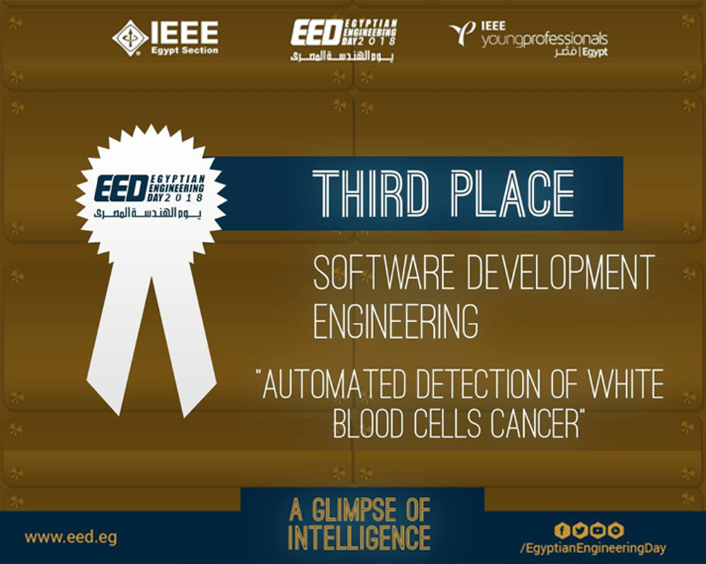 The Faculty of Computer Science in MIU is proud to announce that the senior students of class 2017/2018 group (Automated Detecting of White Blood Cells Cancer) won third place at EED (Egyptian Engineering Day) in the Software Development Competition which was held from the 15th till the 16th of September 2018 at Al-Azhar Conference Center (ACC).