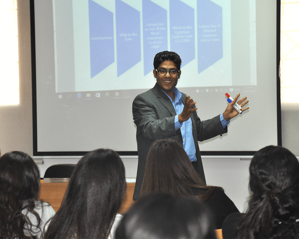 On Monday 15th October 2018, a workshop on “Employee Relations and Regulations” was held by the Department of Management and Marketing, Faculty of Business Administration and International Trade. The workshop was presented by Dr Nabil El Hady and it was attended by 42 students. The workshop aimed at providing Business Faculty students with knowledge and applications about the individual labor contract, rules & required documents for hiring foreign labor, employees’ rights & duties, as well as the dismissal & the contract termination.