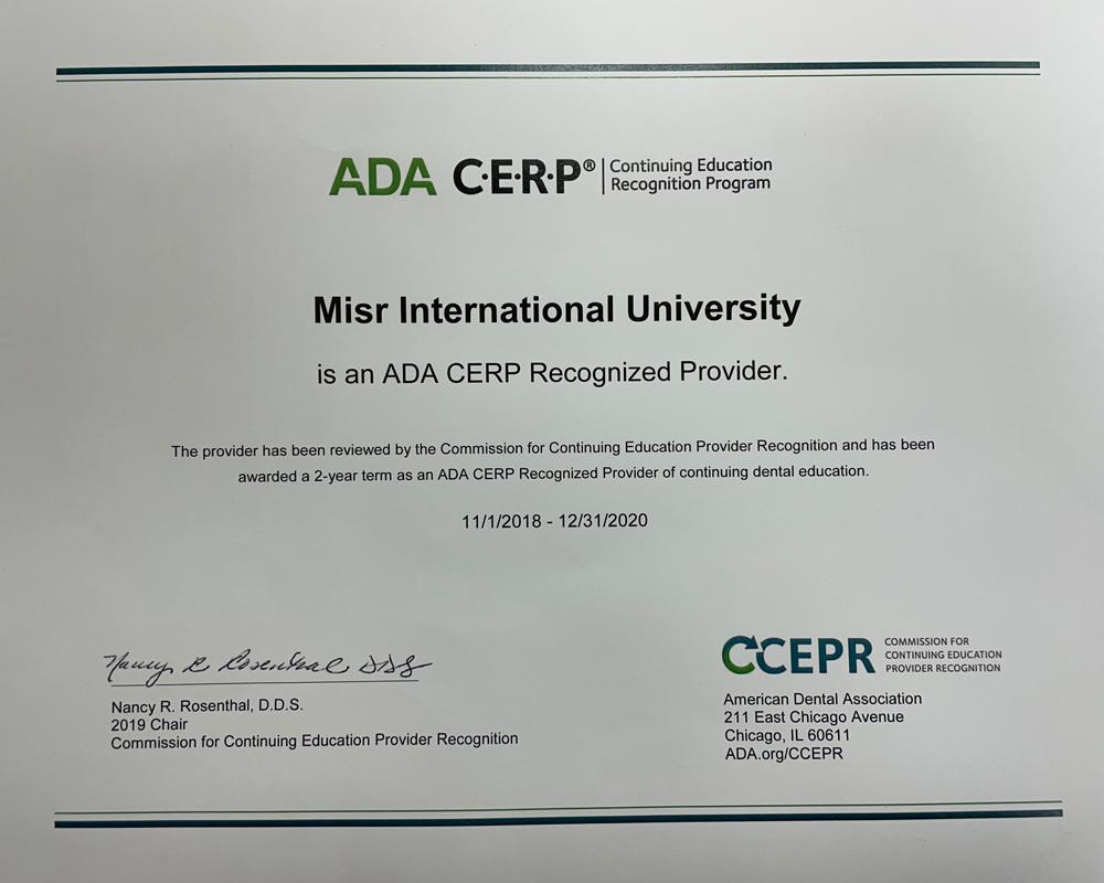Misr International University is an American Dental Association Commission for Continuing Education Provider Recognition (ADA CERP) Recognized Provider.