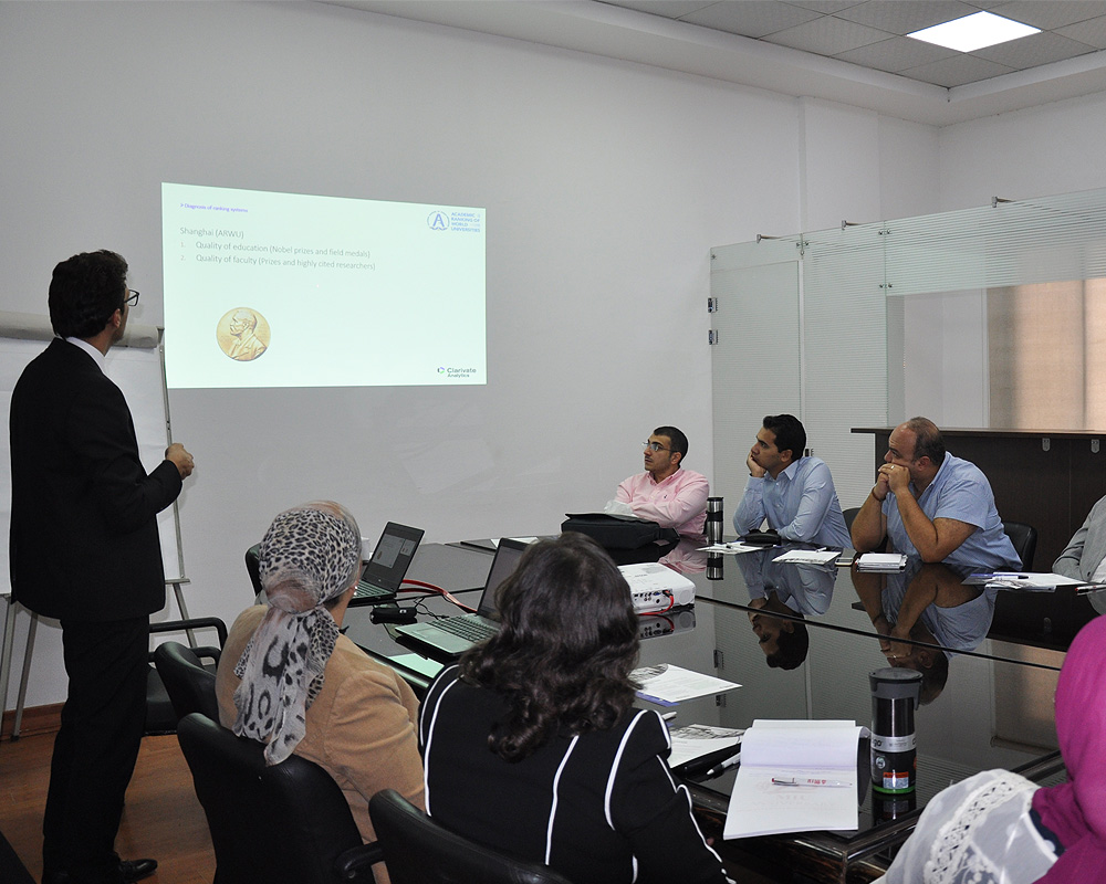 The workshop was conducted by Consultancy Services and Client Education (MENA team) represented by Ph.D. Walid Hassan, Ph.D. Ayman Akil, and Amine Triki. It focused on finding and accessing scientific research, identifying key opinion leaders, authoring research and collaboration, as well as professional services. Faculty members and teaching assistants from all faculties attended the workshop.