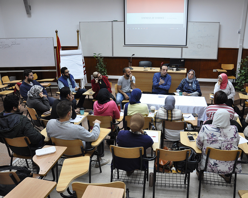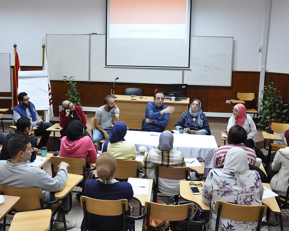 The University Community Services and Environmental Affairs Committee organized a workshop entitled “SYNTHESIS OF EVIDENCE” on Sunday the 2nd of December, 2018. The workshop was given by Prof. Ashraf F Nabhan, Department of Obstetrics and Gynecology, Ain Shams University, Vice Chairman, Regional Research Committee for Africa and Eastern Mediterranean, HRP Alliance, WHO Associate Editor, Cochrane Pregnancy and Childbirth. The purpose of the workshop was to explain the standards for initiating a systematic review and discuss the way to develop a systematic review protocol.