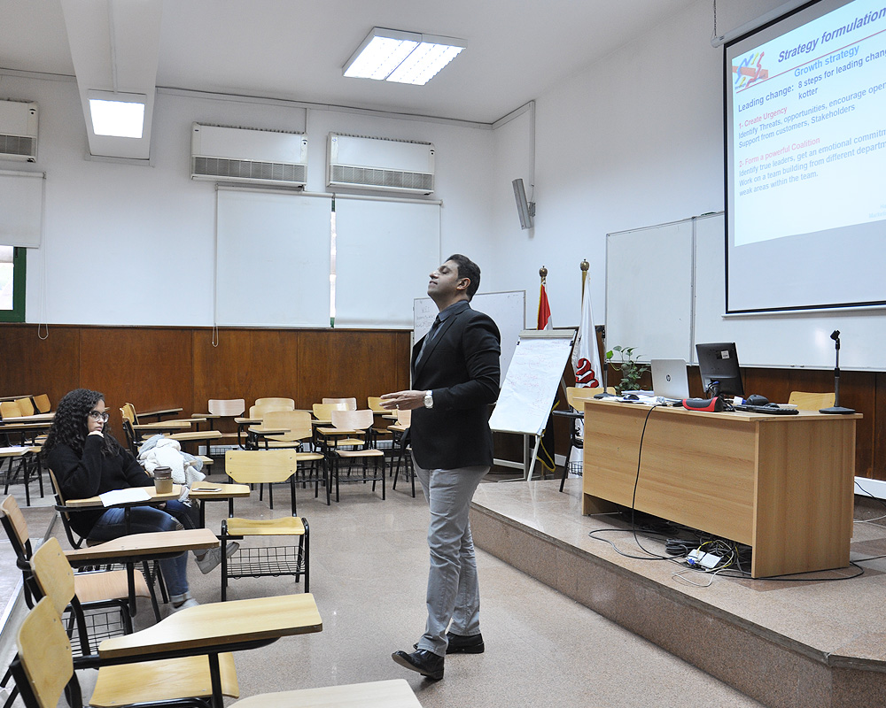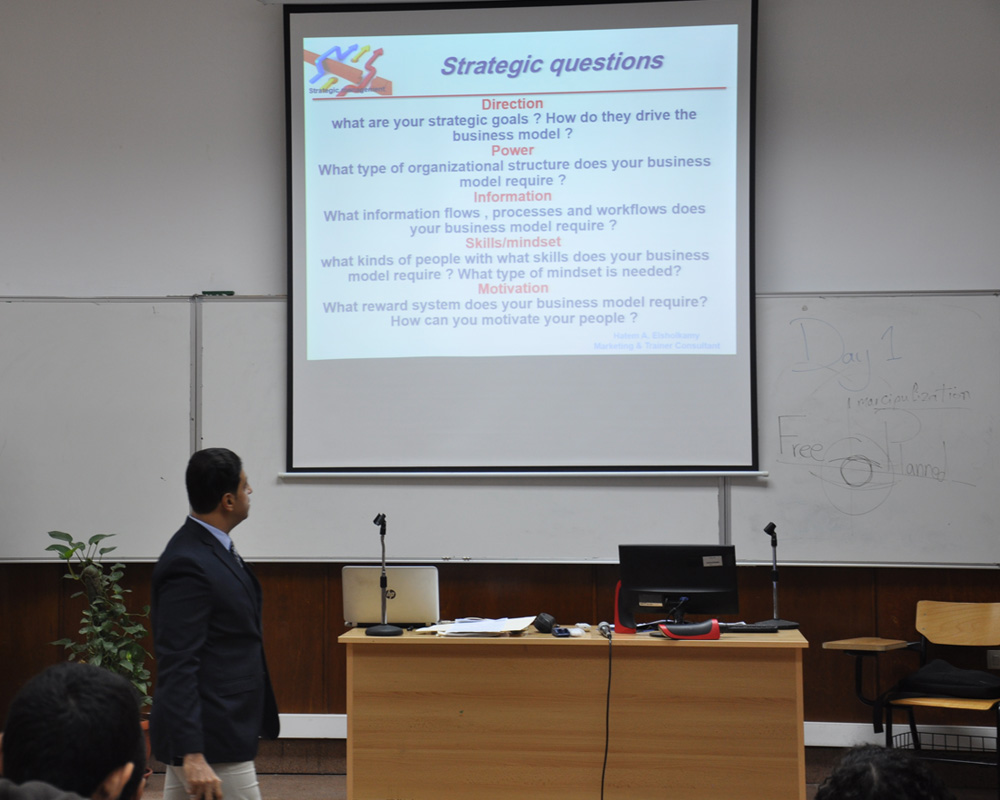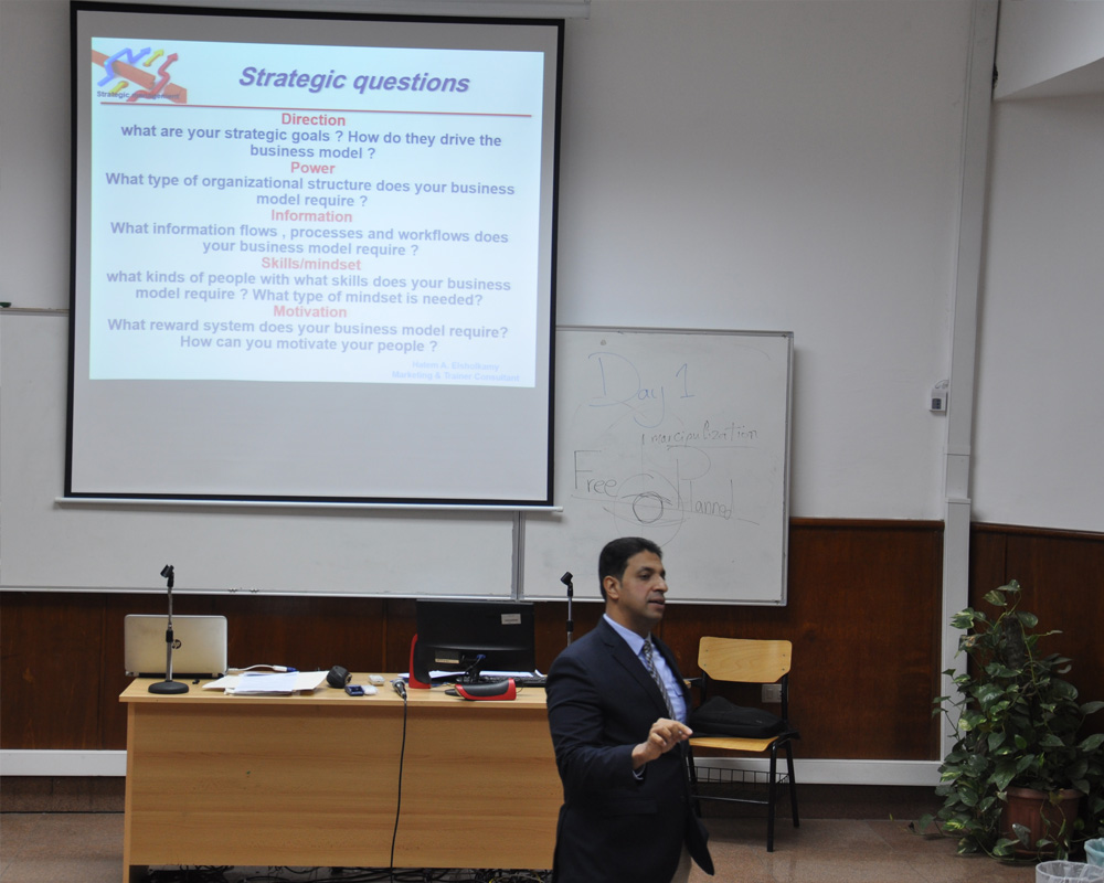 To enhance the practical experience of students, the Department of Management, Faculty of Business Administration and International Trade, launched for the first time the International Excellence Professional Certificate IEPC which is accredited from IPE / PPA France. The program consists of 8 modules (16 workshops). The first module – “Marketing Management” was conducted on 8thand 9th October 2018. The second module “Strategic Management” was conducted by Dr Hatem El Sholkamy together with a two-day workshop on the 10th and 11th of December, 2018. During the IEPC Strategic Management Module, the students practically exercised answering major questions such as “What are the strategic goals and how do they drive the business model, what type of organization structure can fit your business more? What information flows, processes and work flows does your business require? What type of people’s mindset and skills suit your business model? What reward system should your business apply?