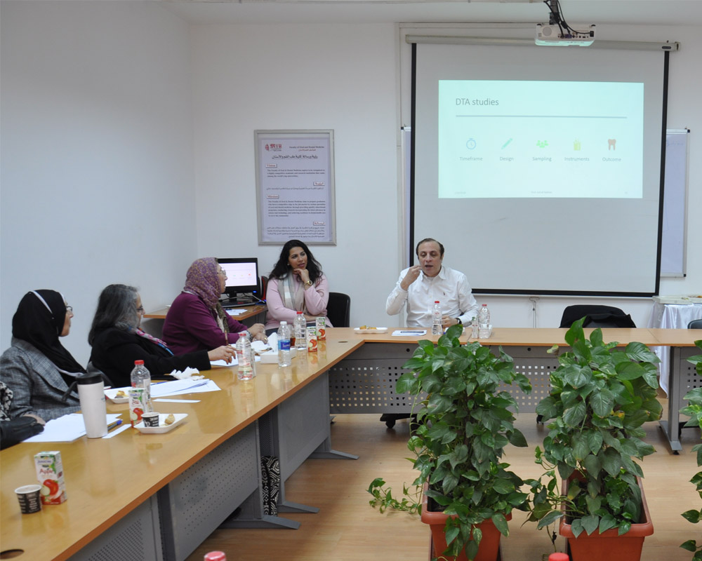 on Monday 21st of January 2019 entitled “Advanced Research Methods”. it was introduced by Prof. Ashraf F Nabhan, Professor of Obstetrics & Gynecology, Ain Shams University, Co-Chair of the Advisory Board of the HRP Alliance, WHO and Associate Editor of Cochrane Pregnancy and Child Birth. The workshop focused on different study designs including prevalence studies, case-control, cohort as well as prognostic studies. The workshop was mainly designed for members of both research and ethics committees as well as faculty members and teaching assistants from both the Faculty of Oral and Dental Medicine and the Faculty of Pharmacy.