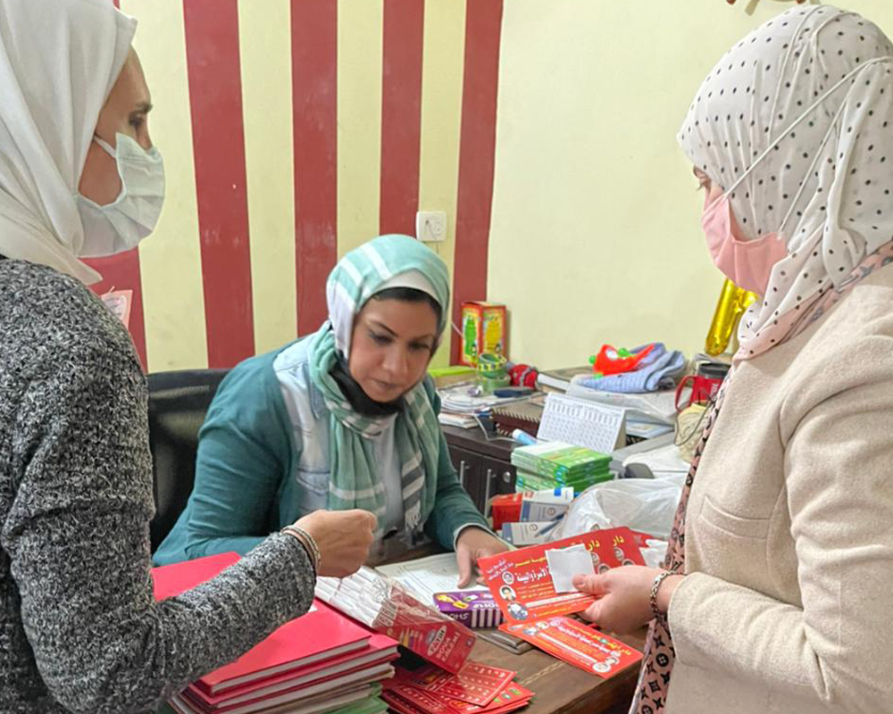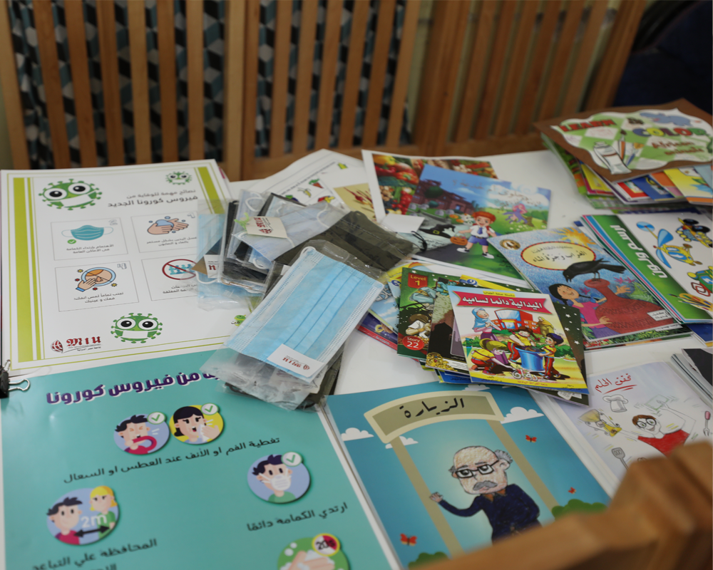 They handed out English stories written and designed by Al Alsun students, posters designed by Mass Communication students to raise awareness of COVID-19, in addition to stationary and drawing materials for the kids.